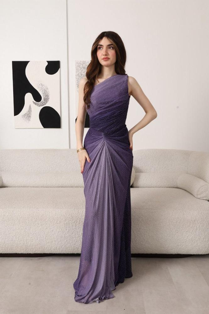 فستان سهرة بنفسجي متدرج بكتف واحد و فصوص لامعه