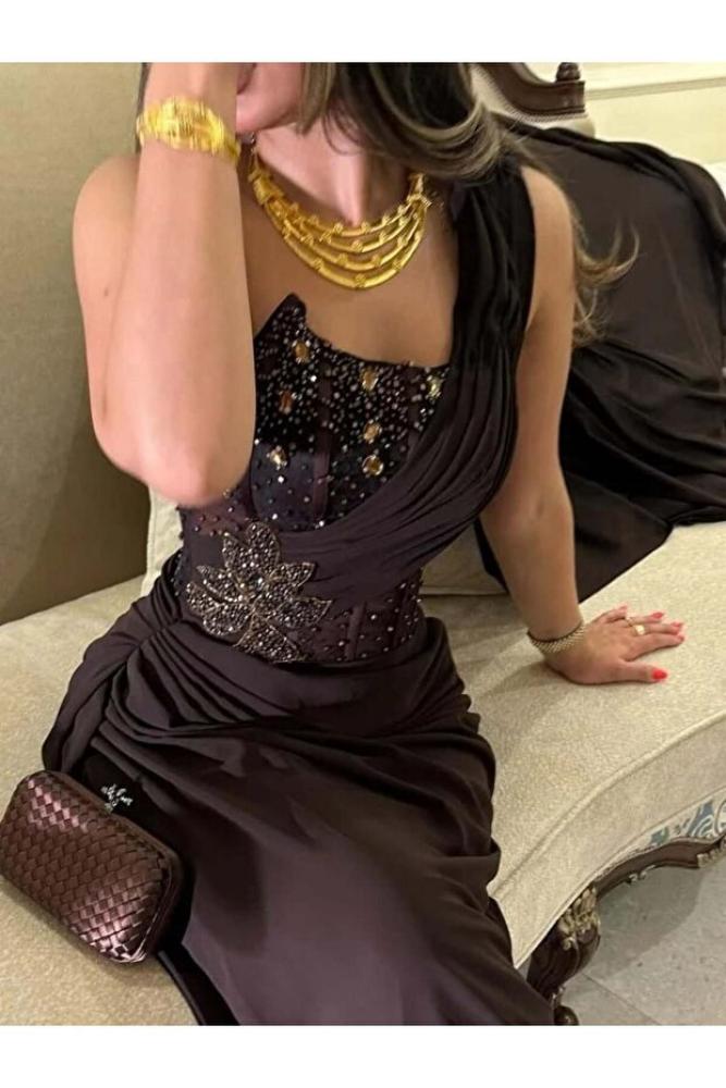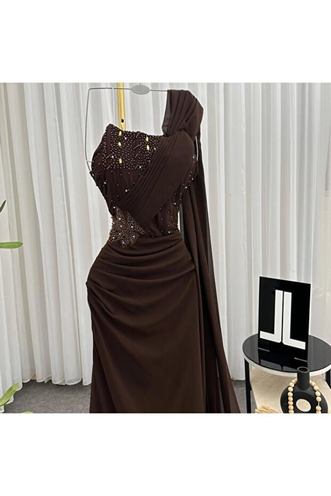فستان سهره طويل جورجيت بني بتطريز يدوي فاخر