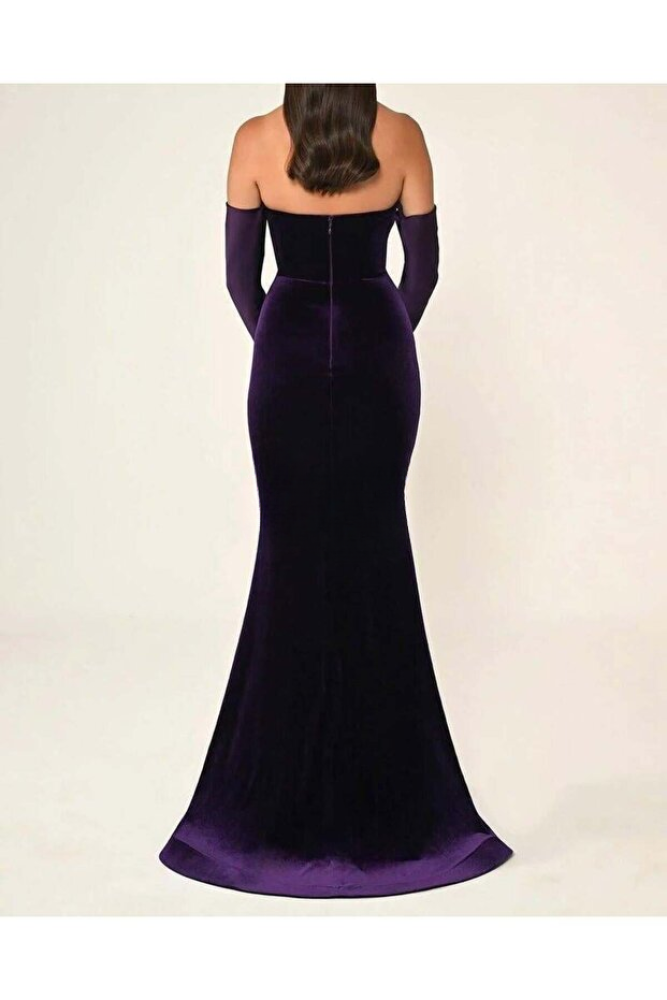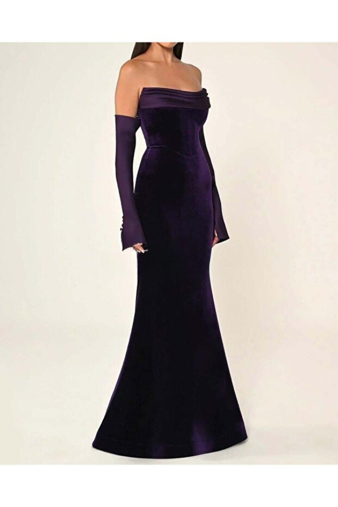 فستان مخمل ناعم موف غامق بأكتاف مكشوفة بتصميم أنيق